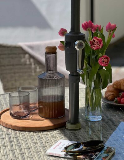 Open the double doors from the lounge and step onto your own private enclosed patio, a perfect spot for relaxation. This charming area features a seating arrangement for four, complete with a sunshade to keep you comfortable during sunny afternoons. Whether you’re enjoying a meal outdoors, diving into a good book, or simply soaking in the tranquility, this patio is your personal oasis. Plus, it’s a safe space for your supervised pets to enjoy the fresh air.