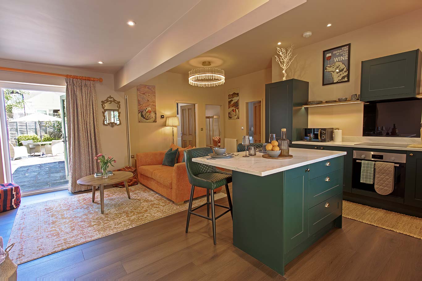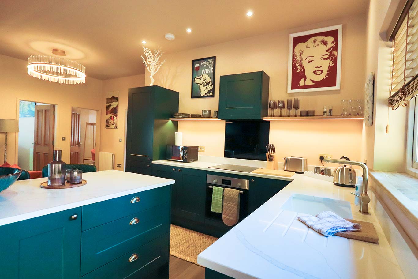An open plan luxury kitchen with all mod cons, convenient dining area and comfort lounge provides ideal space for holiday living.