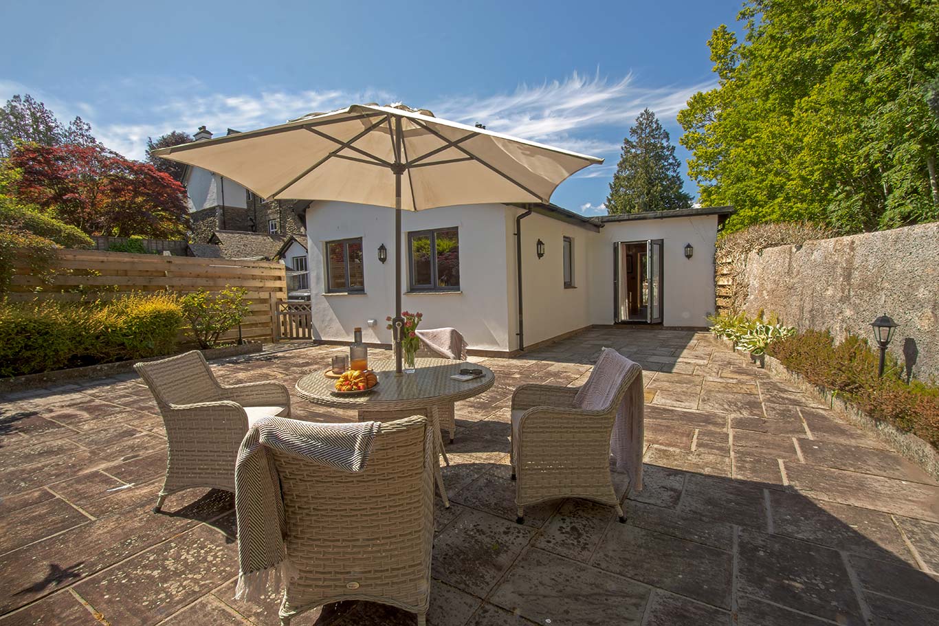 French doors lead from the living area out to a large enclosed private patio area with furniture provided and ideal for al fresco dining. Oakthwaite Lodge is all on one level.